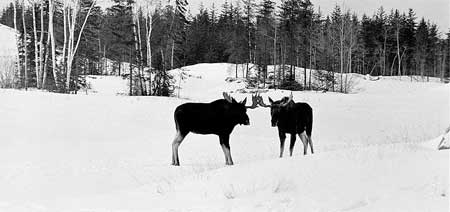 Winter Wonderland: In North America, during the winter, moose may form loose aggregations in fairly dense conifer forests, which they keep open by trampling the snow. In the spring, moose can often be seen in drainage ditches at the side of roads, taking advantage of road salt which has run off the road. These minerals replace electrolytes missing from their winter diet.