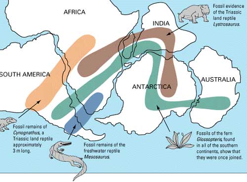 The Plants and Animals Match: Wegener noticed that fossils from the Paleozoic era (544 to 245 million years ago) from different continents are often quite similar! In particular, he was fascinated by matching plant and animal fossils on the coastlines of South America and Africa . He realized that these animals had too much in common to have evolved independently. Also, it would have been impossible for most of these ancient organisms to travel across the vast ocean separating the two continents today. These identical fossil species presented compelling evidence that the two continents were joined when they evolved.